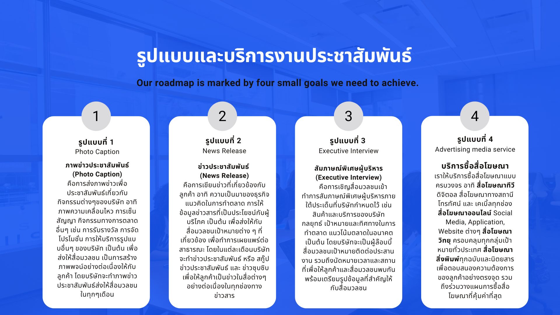 กว่า 25 ปี ในวงการ และ 10 ปีของบริษัทฯ เราดูแลลูกค้าไม่น้อยกว่า 250 องค์กร จากทั้งหน่วยงานภาครัฐและเอกชน อาทิ กรมส่งเสริมอุตสาหกรรม กระทรวงอุตสาหกรรม และกรมส่งเสริมการค้าระหว่างประเทศ กระทรวงพาณิชย์ รวมถึงองค์กรจากต่าง ๆประเทศ อาทิ การท่องเที่ยวในแถบภูมิภาค โทโฮคุ ประเทศญี่ปุ่น งานมอบรางวัลบอลีวูด IIFA 2018 จากประเทศอินเดีย และด้วยการดำเนินงานอย่างมีประสิทธิผล ทำให้เราได้ครองใจลูกค้าและสื่อมวลชนอย่างเหนียวแน่น เพื่อทำหน้าที่เป็นศูนย์กลางส่งต่อข้อมูลข่าวสารของลูกค้าไปสู่สาธารณชนผ่านสื่อมวลชน ไม่ว่าจะเป็นหนังสือพิมพ์ นิตยสาร สื่อออนไลน์ สื่อวิทยุ และสื่อทีวีต่าง ๆ.