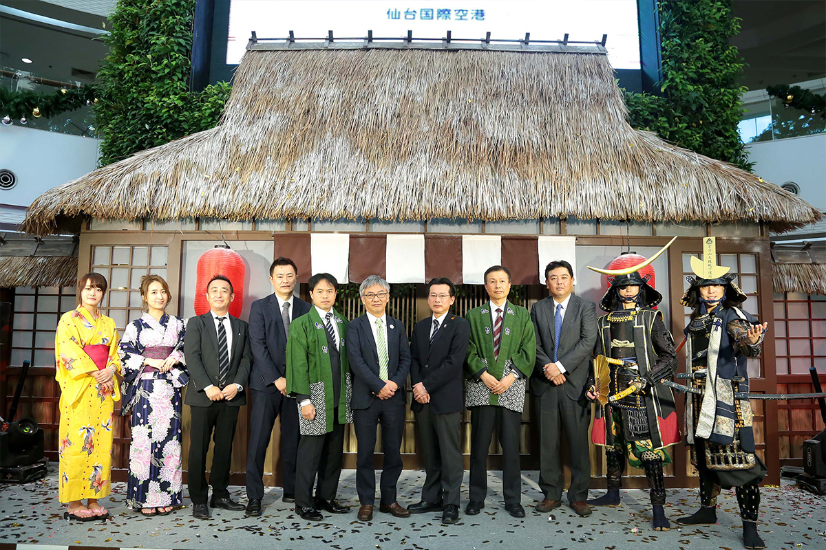 นายทากูยะ อิวาอิ (กลาง) ผู้แทนประธานสนามบินนานาชาติเซนได และนายฮิเดะฮิโกะ ไอซาวะ ผู้อำนวยการสนามบินมิยากิ พร้อมด้วยนายฮิเดะทะกะ ยะนะทสึ ผู้อำนวยการอาวุโส สำนักงานการท่องเที่ยวเซนได ร่วมกันทำพิธีเปิดงาน Beauty Tohuku มหกรรมงานจำลองบรรยากาศของโทโฮะขุ ในแบบอาหาร ท่องเที่ยว และความงาม เพื่อส่งเสริมให้เกิดการท่องเที่ยว รวมถึงเปิดประสบการณ์ให้ชาวไทยได้รู้จักภูมิภาคโทโฮะขุมากยิ่งขึ้น ณ รอยัล พาร์ค พลาซ่า ชั้น 1 ศูนย์การค้า เดอะพาราไดซ์ ปาร์ค ศรีนครินทร์