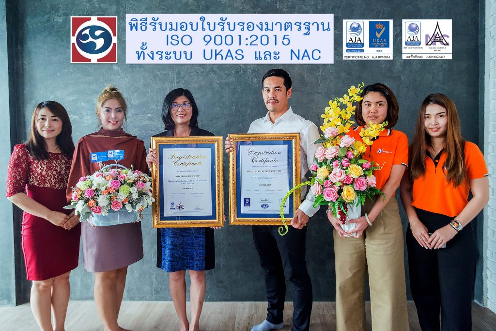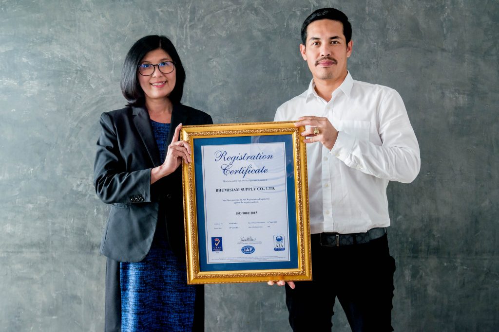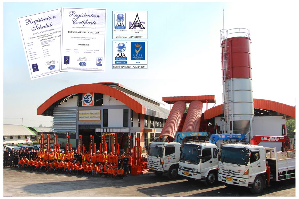 นายรัฐโรจน์ ภูริหิรัญพิพัฒ (ที่ 3 จากขวา) กรรมการผู้จัดการบริษัท ภูมิสยาม ซัพพลาย จำกัด ผู้ผลิตและจัดจำหน่าย พร้อมให้บริการตอกเสาเข็มด้วยนวัตกรรมสปันไมโครไพล์ รับมอบใบรับรองมาตรฐาน ISO 9001:2015 ทั้งระบบ UKAS และ NAC ที่คลอบคลุมทั้งการออกแบบ ผลิต และให้บริการตอกเสาเข็มสปันไมโครไพล์ ด้วยเทคโนโลยีการผลิตขั้นสูงจากประเทศเยอรมัน จากคุณสิตา ประวาลพิทย์ (ที่ 3 จากซ้าย) กรรมการผู้จัดการบริษัท เอเจเอ รีจีสตร้าส์ จำกัด ผู้ให้บริการตรวจประเมินและรับรองคุณภาพระบบ ISO ณ บริษัท ภูมิสยาม ซัพพลาย จำกัด อำเภอลำลูกกา จังหวัดปทุมธานี