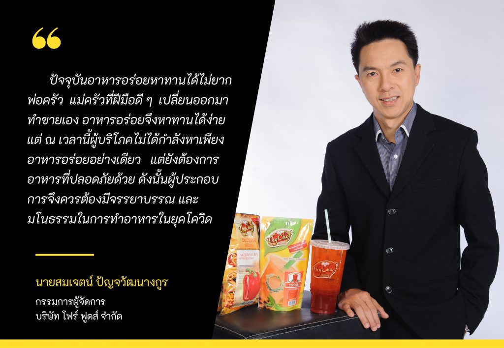 นายสมเจตน์ ปัญจวัฒนางกูร กรรมการผู้จัดการ บริษัท โฟร์ ฟูดส์ จำกัด ผู้ผลิตและจัดจำหน่ายผลิตภัณฑ์อาหารคุณภาพสูงให้กับกลุ่มอุตสาหกรรมอาหารทั้งในและต่างประเทศ เปิดเผยว่า การระบาดระลอกนี้ซ้ำเติมผู้ประกอบการธุรกิจอาหารโดยตรง ทั้งธุรกิจอาหารขนาดใหญ่ และขนาดย่อย (SME) ผู้ประกอบการจึงควรยึดถือจรรยาบรรณและซื่อสัตย์ต่อวิชาชีพของตนเอง รวมถึงหมั่นเรียนรู้และปรับตัวให้สอดคล้องกับสถานการณ์ปัจจุบัน ทั้งในด้านการผลิตและการจัดจำหน่าย เพื่อให้ธุรกิจดำรงอยู่ได้และเติบโตได้อย่างยั่งยืน ซึ่งถือเป็นจรรยาบรรณของผู้ประกอบการอาหารในสถานการณ์โควิด-19