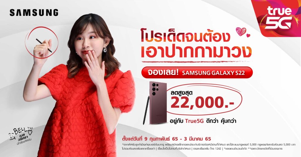 ซัมซุง ส่งน้องเบล วริศรา จิตปรีดาสกุล เจ้าของผลงานเพลงน่ารักใสๆ  “เอาปากกามาวง” ที่กำลังโด่งดังสุดๆ ในโซเชียลขณะนี้ มาร่วมพลิกโฉมประสบการณ์การใช้สมาร์ทโฟนที่ทุกคนเคยรู้จัก ด้วยสุดยอดกล้องประสิทธิภาพ และการเชื่อมต่อที่ดีที่สุดเท่าที่เคยมีมาในสมาร์ทโฟนซัมซุง กาแลคซี่ กับสมาร์ทโฟนสุดล้ำแห่งปี พร้อมโปรเด็ดสุดๆ จากทรู 5G จนน้องเบลต้องเอาปากกามาวง ให้เหล่าสาวกซัมซุงได้สัมผัสสุดยอดประสิทธิภาพเครือข่ายอัจฉริยะอันดับ 1 เร็ว ครบ แรง ล้ำ การันตีด้วยรางวัล nPerf 6 ปีซ้อนกับทรู 5G พบข้อเสนอเหนือระดับกว่าใคร เอ็กซ์คลูซีฟเฉพาะลูกค้าทรูเท่านั้น! กับโปรซื้อ 1 แถม 1 เมื่อสั่งจอง Samsung Galaxy S22 Ultra 5G (128 GB) พร้อมสมัครแพ็กเกจตามเงื่อนไขที่กำหนด รับฟรีทันที Samsung Galaxy S22 5G ระยะสัญญา 24 เดือน หรือเลือกรับส่วนลดสูงสุด 22,000 บาท สำหรับลูกค้าที่ย้ายค่ายเบอร์เดิมรับส่วนลด 5,000 บาท และทรูการ์ดใช้คะแนนทรูพอยท์ 5,000 ทรูพอยท์ แลกรับส่วนลด 5,000 บาท นอกจากนี้ยังได้รับสิทธิพิเศษสุดฮอต ดังนี้