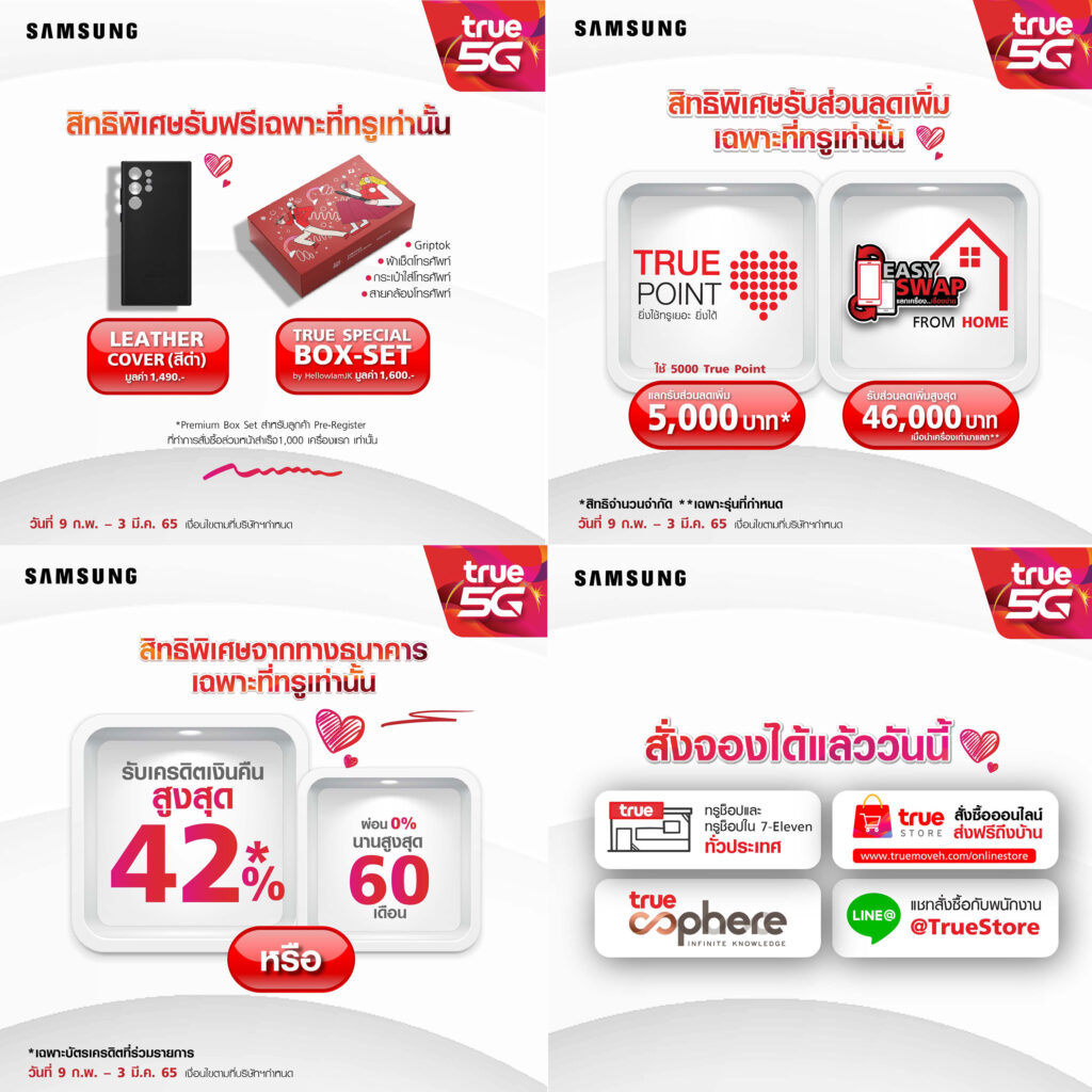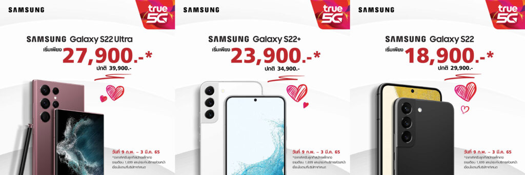 สำหรับผู้ที่สนใจสมาร์ทโฟน Samsung Galaxy S22 Series สามารถจองได้ตั้งแต่วันนี้ – 3 มีนาคม 65 และรับสินค้าได้ตั้งแต่วันที่ 3 มีนาคม 65 เป็นต้นไป พิเศษ!! สำหรับลูกค้าที่ทำการ Pre-Register สามารถจองได้ตั้งแต่วันนี้ – 22 กุมภาพันธ์ 65 พร้อมรับเครื่องเป็นกลุ่มแรก ในวันที่ 25 กุมภาพันธ์ 65 จับจองเป็นเจ้าของได้ที่ ทรูช็อป ทุกสาขา และช่องทางออนไลน์ https://galaxys22.truemoveh.com/prebooking/ เว็บไซต์ True Store และ Line@ True Store ที่ ทรูช็อป สาขาที่เลือกไว้ สอบถามรายละเอียดเพิ่มเติมได้ที่ ทรู คอลเซ็นเตอร์ 1242 หรือ https://truemoveh.truecorp.co.th/