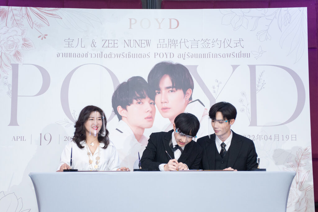 โดย POYD ได้คว้าสองคู่จิ้น ซี-นุนิว ที่กำลังโด่งดังสุด ๆ จากซีรีส์ นิ่งเฮียก็หาว่าซื่อ Cutie Pie Series ในขณะนี้มาเป็นพรีเซ็นเตอร์ และถือว่าเป็นพรีเซ็นเตอร์ชายคนแรกของแบรนด์ POYD อีกด้วย ซี่งทั้ง 2 คนมีคาแรคเตอร์ที่ทางแบรนด์มองไว้ คือ เป็นเด็กรุ่นใหม่ที่ชอบดูแลตัวเอง มีความน่ารักสดใส และสามารถพรีเซนต์สบู่รังนกพรีเมี่ยม POYD ได้ เพราะต้องการเข้าถึงกลุ่มลูกค้าทุกเพศที่อายุตั้งแต่ 18 ปีขึ้น รวมถึงผลิตภัณฑ์นี้ไม่จำเป็นต้องใช้เฉพาะคนอายุเข้าเลข 3 เท่านั้น แต่สามารถเริ่มดูแลตัวเองตั้งแต่เนิ่น ๆ เลย ที่สำคัญคือสามารถใช้ได้กับทุกกลุ่มและทุกเพศจริง ๆ