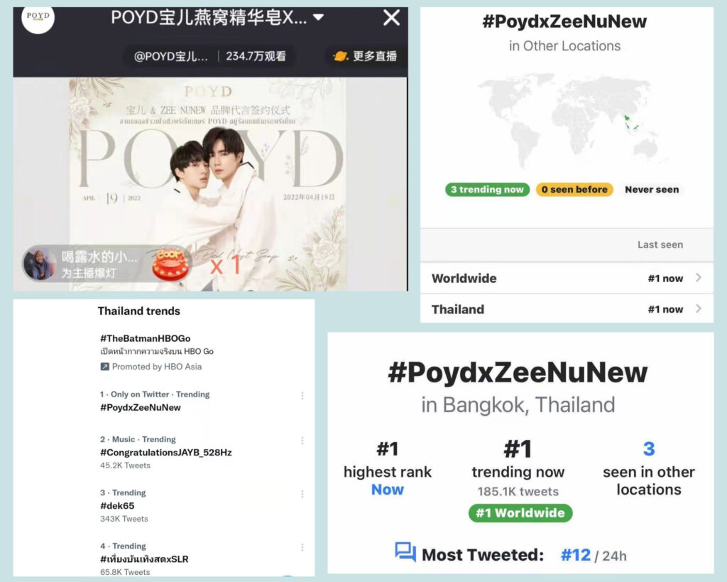 สำหรับงานนี้ แฮชแท็ก #PoydxZeeNuNew ตอกย้ำความปังและความนิยมทั้งของพรีเซ็นเตอร์และฝั่งแบรนด์ POYD แบบขั้นสุดจนสามารถขึ้นเทรนด์ทวิตเตอร์ติดอันดับ 1 ของโลกและอันดับ 1 ของไทย รวมถึงมีผู้ชมจากประเทศจีนที่เข้าชมขณะไลฟ์ผ่านช่องทาง Weibo มากถึง 2 ล้านคน